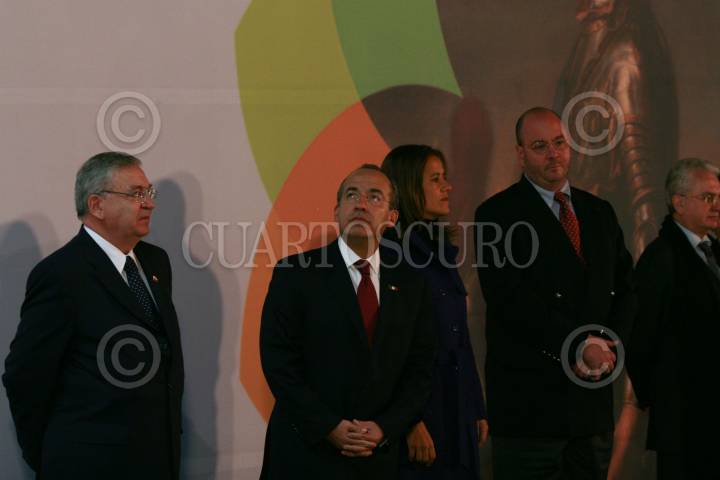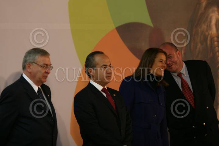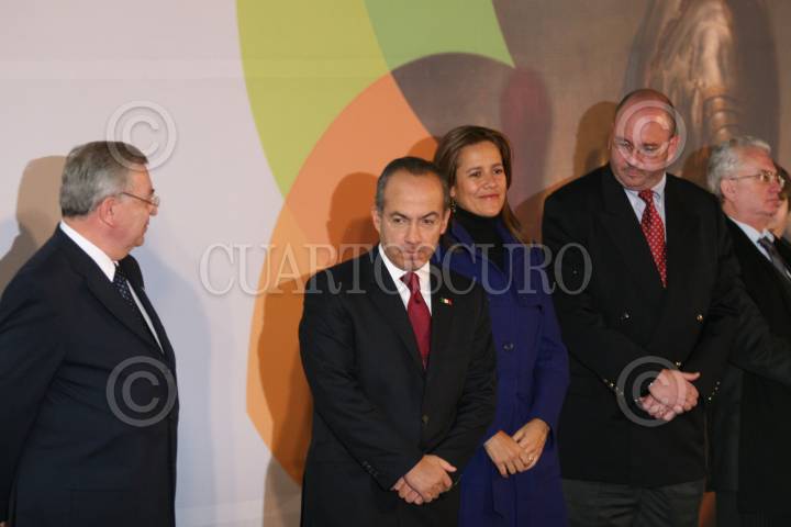 MÉXICO D.F., 05DICIEMBRE2008.-El presidente, Felipe Calderón Hinojosa, acompañado de su esposa Margarita Zavala, acudió esta noche a la inauguración de la exposición “Zares Arte y Cultura del Imperio Ruso” esto en el Museo Nacional de Antropología. En la imagen son acompañados por José Enrique Ortiz curador de la exposición y Sergio Vela Presidente de CONALCULTA. FOTO: GUILLERMO PEREA/CUARTOSCURO.COM