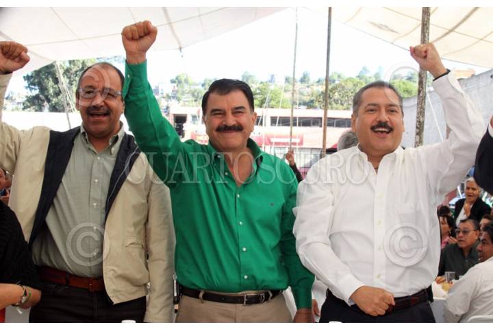 SAN PABLO DEL MONTE, TLAXCALA, 07JUNIO2010.- Hilario Salas, candidato a presidente municipal de San Pablo del Monte; Javier López Zavala, candidato a gobernador de Puebla; Mariano Gómez Zarur, candidatoa gobernador de Tlaxcala; y Mario Montero Serrano, candidato a presidente municipal de Puebla, abanderados por la alianza PRI-PVEM, realizaron la firma por el Desarrollo Metropolitano, en la que se comprometen a trabajar en conjunto para beneficiar a los estados vecinos. FOTO: FRANCISCO GUASCO/CUARTOSCURO.COM