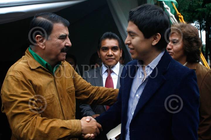 SAN MIGUEL CONTLA, TLAXCALA, 27JUNIO2010.- Mariano González Zarur, candidato a gobernador por la alianza PRI-PVE en el estado de Tlaxcala, fue felicitado por Mario Marín García, hijo del mandatario de Puebla, tras recibir su constancia de mayoría de votos por el Instituto Electoral de Tlaxcala (IET), que lo acredita como ganador de la contienda electoral del pasado 4 de julio. FOTO: FRANCISCO GUASCO/CUARTOSCURO.COM