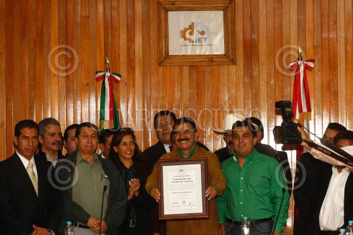 SAN MIGUEL CONTLA, TLAXCALA 09JULIO2010.- Mariano González Zarur, candidato a gobernador por la alianza PRI-PVE, recibió su constancia de mayoría de votos por el Instituto Electoral de Tlaxcala (IET), que lo acredita como ganador de la contienda electoral del pasado 4 de julio. FOTO: FRANCISCO GUASCO/CUARTOSCURO.COM