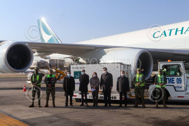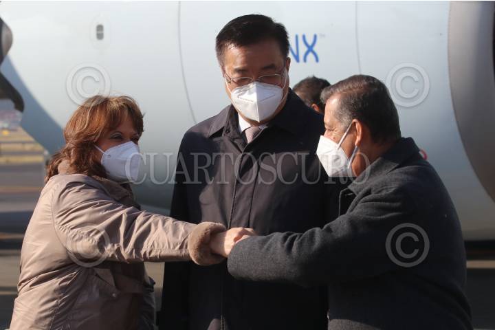 Martha Delgado, subsecretaría para Asuntos Multilaterales y Derechos Humanos; Zhu Qingqiao, embajador Extraordinario y Plenipotenciario de China ante los Estados Unidos Mexicanos y Luis Antonio Ramírez, director del ISSTE encabezaron el arribo de 200 mil vacunas Sinovac provenientes de Hong Kong para el Covid-19