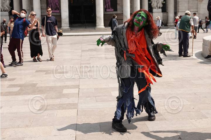 Una mujer caracterizada de zombie camina enfrente del Palacio de Bellas Artes