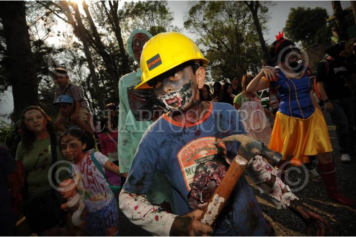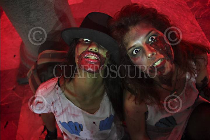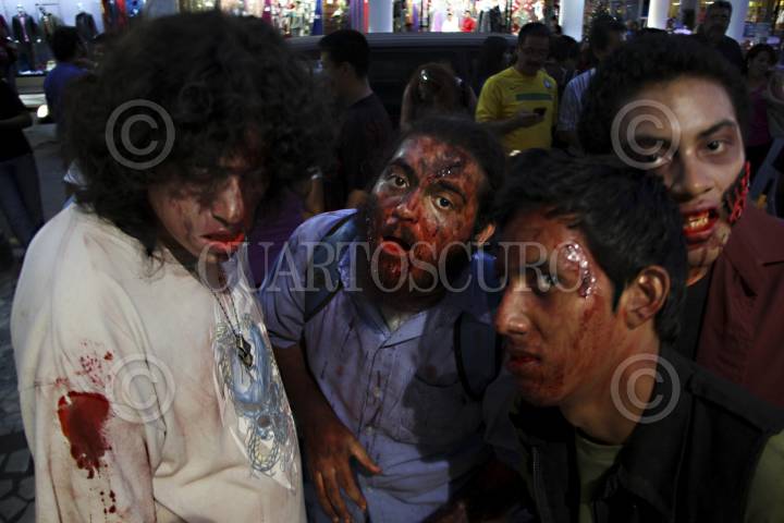 MÉXICO, D.F., 03NOVIEMBRE2012.- Miles de personas realizaron la sexta edición de la "Marcha Zombie" 2012 que partió del Monumento a la Revolución hacía el Zócalo capitalino, con una afluencia estimada en más de 20 mil zombies. En el evento también denominado "la marcha de los muertos vivientes" se simularon enfrentamientos de golpes y disparos entre zombies y humanos FOTO: DIEGO SIMÓN SÁNCHEZ /CUARTOSCURO.COM