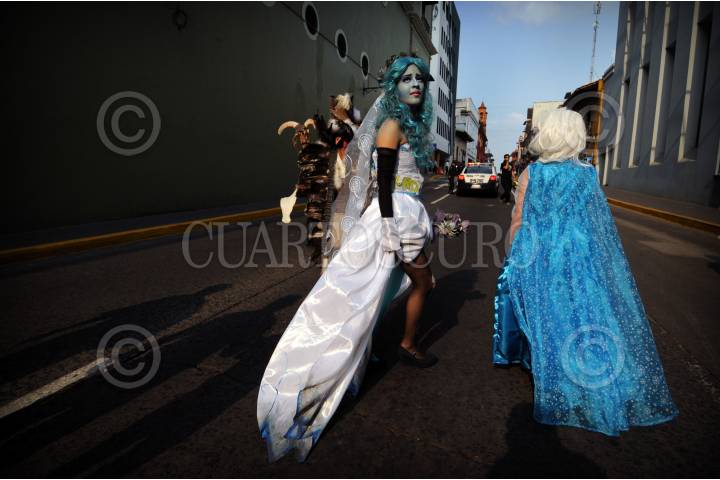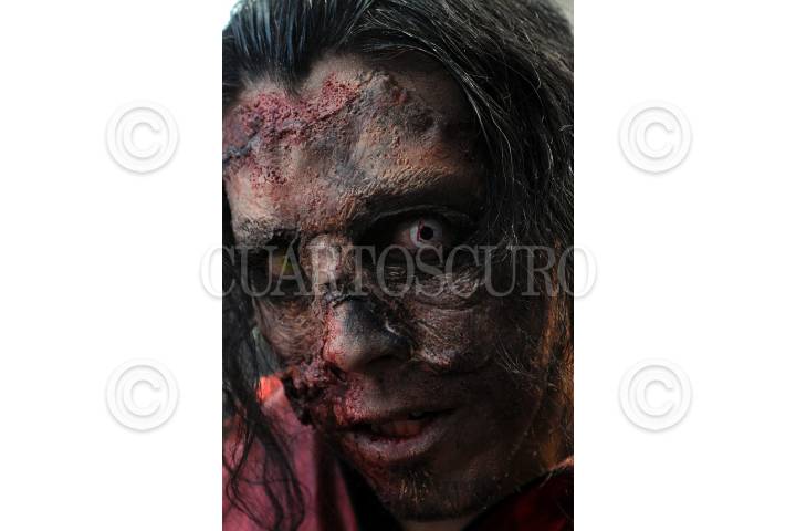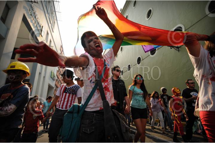 VERACRUZ, VERACRUZ, 03NOVIEMBRE2012.- El día de ayer decenas de jóvenes caracterizados salieron de las tumbas para participar en el primero Zombie Walk que se realiza en el puerto de Veracruz, en donde caminaron por las principales calles de la ciudad y culminaron su peregrinación en la plaza principal. FOTO: FÉLIX MÁRQUEZ /CUARTOSCURO.COM
