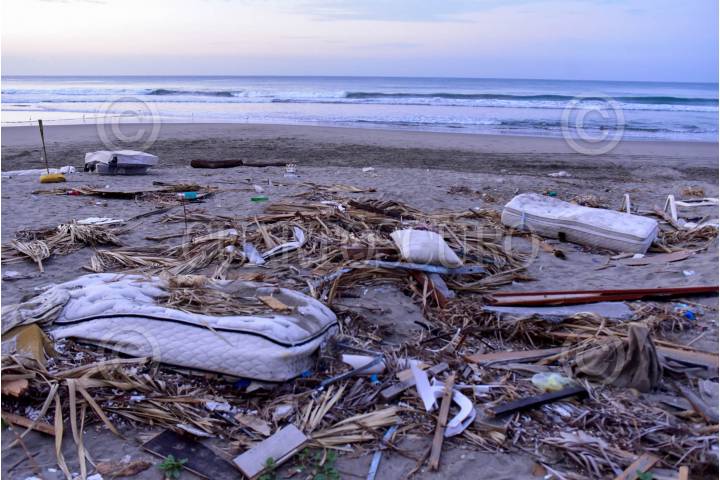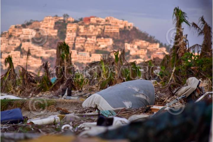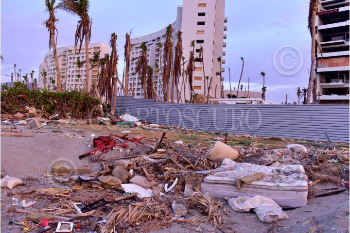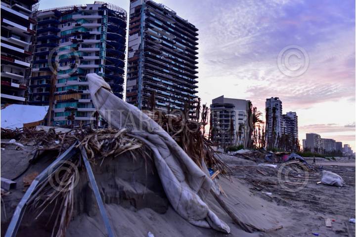 ACAPULCO, GUERRERO, 10DICIEMBRE2023.- A 46 días del impacto del huracán Otis en Acapulco, en la Playa Revolcadero aún se observan los severos estragos que causó el fenómeno natural, ubicada en la exclusiva Zona Diamante esta zona contaba con hoteles de Gran Turismo y residenciales de lujo. En la playa se observan todos muebles que evidentemente salieron volando de los departamentos y habitaciones, como colchones y sillas. FOTO: CARLOS ALBERTO CARBAJAL/CUARTOSCURO.COM