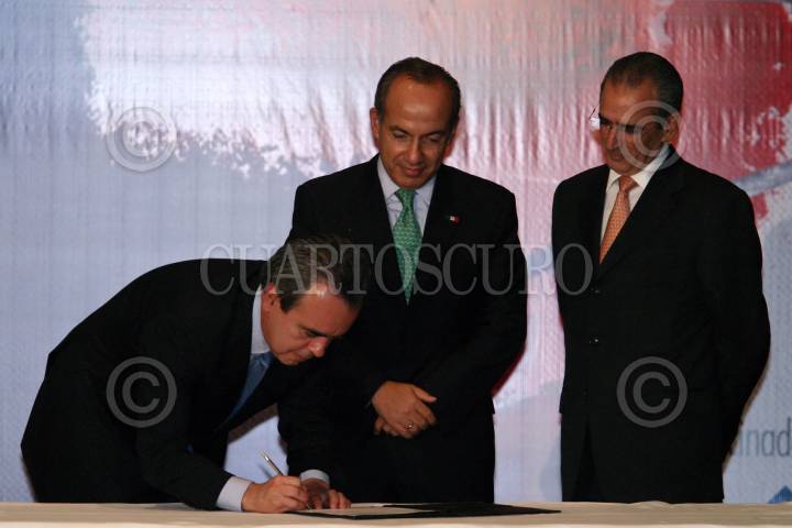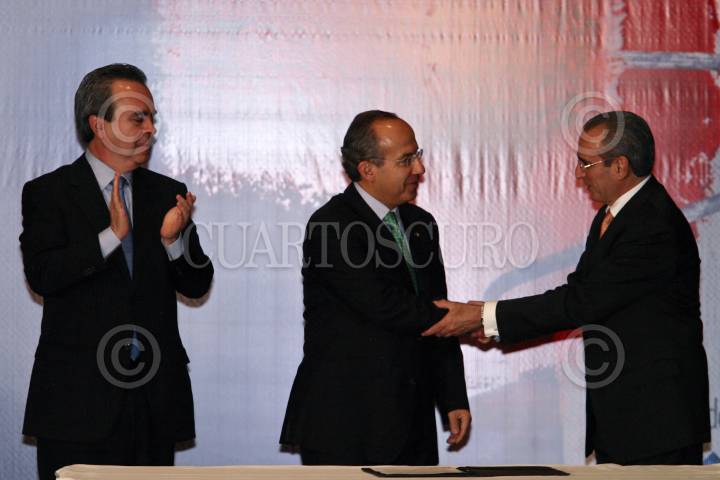 MÉXICO, D.F., 10SEPTIEMBRE2009.- Victor Manuel Borras, director general del Instituto del Fondo Nacional de la Vivienda para los trabajadores (INFONAVIT); el presidente Felipe Calderón y Enrique Zorrilla Fullaondo, director general de BANAMEX durante la firma de convenio de colaboración entre el INFONAVIT y BANAMEX en el marco del 1er Foro Internacional de Vivienda Sustentable que se realizo en un hotel del centro de la ciudad. FOTO: RODOLFO ANGULO/CUARTOSCURO.COM