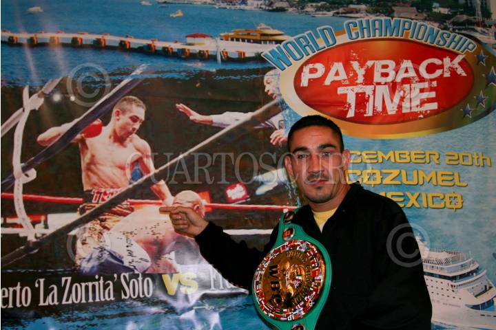 CANCÚN, QUINTANA ROO, 10SEPTIEMBRE2009.- Humberto "La Zorrita" Soto, durante la confencia de prensa para presentar la proxima pelea "Que Viva México De Un Solo Golpe", este 15 de septiembre en la plaza de toros de esta ciudad. En la gala boxistica tambien participara Ulises "El Archie" Solis y el nigeriano peso completo Samuel Peter. "La Zorrita" Soto expondra su cinturon mundial superpluma del CMB ante el colombiano Aristides Perez. FOTO: AMARANTHA PRIETO/CUARTOSCURO.COM