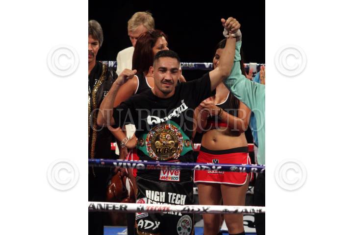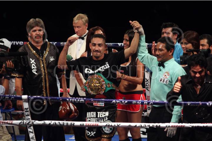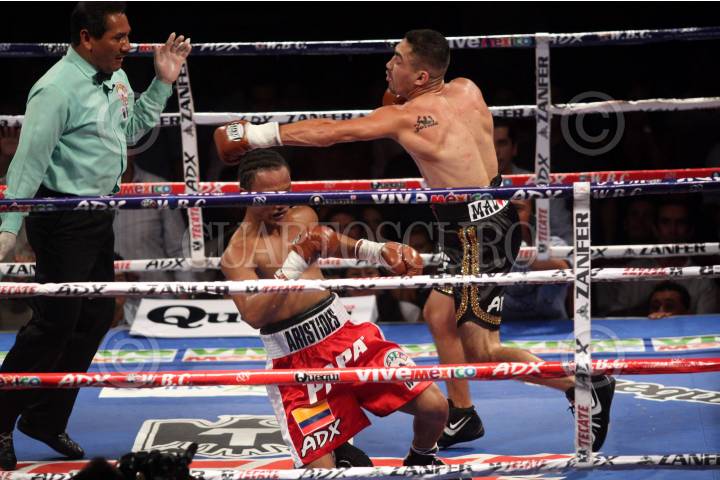 CANCÚN, QUINTANA ROO, 15SEPTIEMBRE2009.- El campeón Mundial por el CMB; Humberto "Zorrita" Soto retuvo esta noche su corona en la división de los Super Plumas al derrotar en el primer asalto a su rival Aristides "Papa" Perez que se realiza en la plaza de toros dentro de la función denominada !Que Viva México¡ De Un Solo Golpe III. FOTO: MARCO POLO GUZMÁN HERNÁNDEZ/CUARTOSCURO.COM