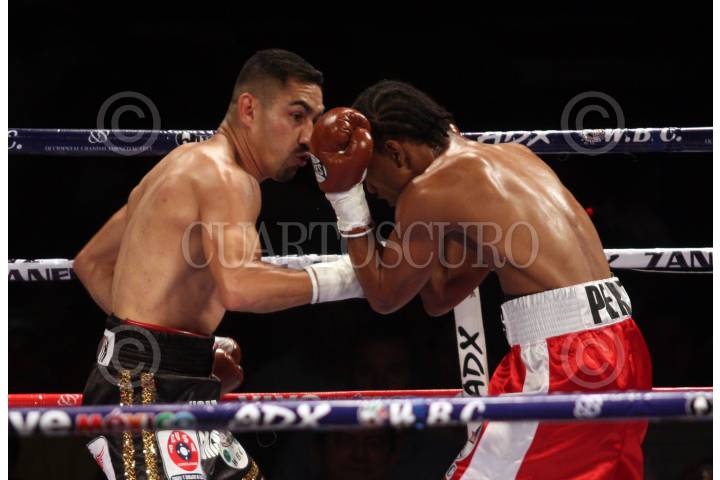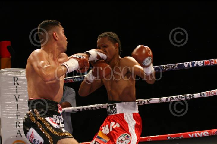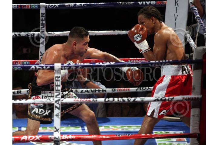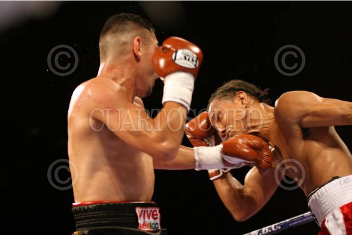 CANCÚN, QUINTANA ROO, 15SEPTIEMBRE2009.-Humberto "Zorrita" Soto, se impuso en el segundo round a Aristides "Papa" Pérez , en la pelea por el cinturón super pluma de la CMB, esto en la función que se realizó en la Plaza de Toros. FOTO: AMARANTA PRIETO/CUARTOSCURO.COM