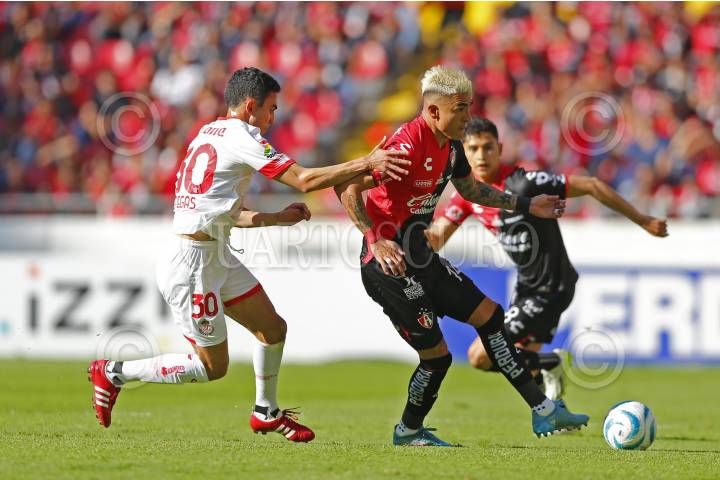 Brian Lozano jugador de Atlas, disputa el balón con el contrario de Toluca, Robert Morales, esto en partido correspondiente a la Jornada 6 del Torneo Apertura Temporada 2023-2024 de la Liga MX.