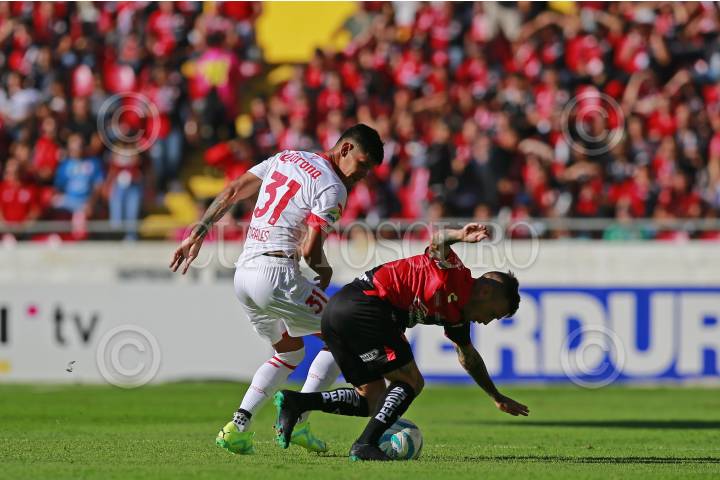 Jordy Caicedo jugador de Atlas, disputa el balón con el contrario de Toluca Jesús Angulo, esto en partido correspondiente a la Jornada 6 del Torneo Apertura Temporada 2023-2024 de la Liga MX.