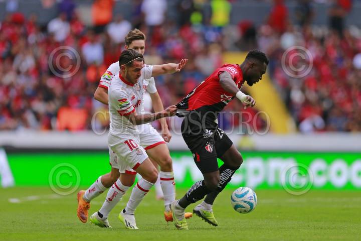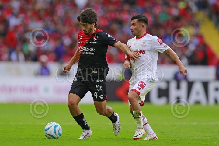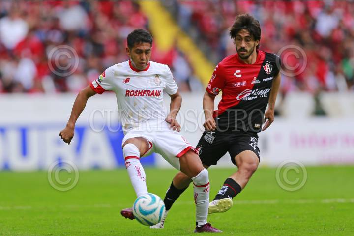 José Abella jugador de Atlas, disputa el balón con el contrario de Toluca, esto en partido correspondiente a la Jornada 6 del Torneo Apertura Temporada 2023-2024 de la Liga MX.