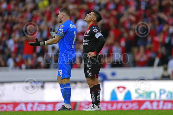 Aldo Rocha jugador de Atlas se lamenta por las fallas durante el juego, esto en partido correspondiente a la Jornada 6 del Torneo Apertura Temporada 2023-2024 de la Liga MX.