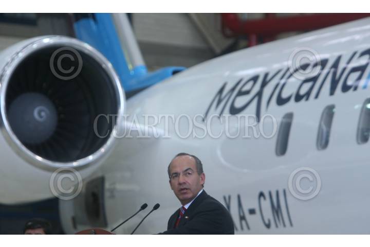 TLAJOMULCO DE ZUÑIGA, JALISCO 10MARZO2009.- Felipe Calderón, Presidente de México, en compañía de Juan Molinar, Secretario de Comunicaciones y Transporte, Emilio Gonzalez Marquez Gobernador del estado de Jalisco y Gaston Azcarraga Andrade, Presidente del Consejo de Administración de Grupo Mexicana, a su llegada a la base de mantenimiento de Mexicana en el Aeropuerto Internacional 'Miguel Hidalgo' en Tlajomulco de Zuñiga. FOTO: ALFREDO GUERRERO/CUARTOSCURO.COM