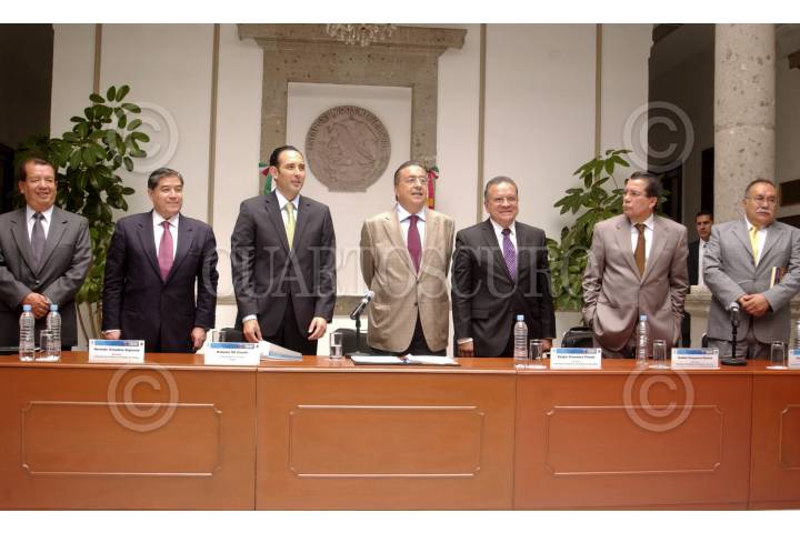MÉXICO, D.F., 01JULIO2010.- Juan Méndez, secretario del Gobierno de Tlaxcala junto a Gerardo González, secretario del Gobierno de Hidalgo; Roberto Gil Zuarth, Subsecretario de Gobierno de la SEGOB; Fernando Gómez Mont, Secretario de Gobernación; Sergio Granados, secretario del Gobierno de Chihuahua; Rafael Oceguera, secretario del Gobierno de Sinaloa; Octavio Macías, secretario del Gobierno de Zacatecas durante la firma del protocolo de coordinación por la seguridad pública. FOTO: CUARTOSCURO.COM
