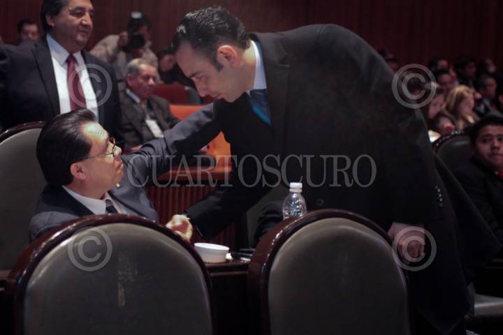 MÉXICO, D.F., 12ENERO2011.- Los diputados René Arce (PRD) y Roberto Gil Zuarth (PAN) durante la sesión de la comisión permanente de la Cámara de Diputados. FOTO: CUARTOSCURO.COM