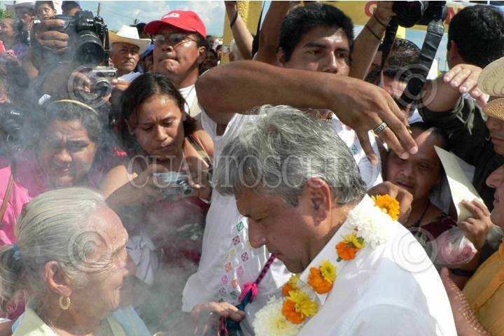 NACAJUCA, TABASCO, 28SEPTIEMBRE2006.- Andrés Manuel López Obrador recorrió en compañía del candidato a la gobernatura local, César Raúl Ojeda Zubieta, las comunidades chontales: Lomitas, Jiménez, Guatacalca, Mazateupa y finalmente, la cabecera municipal. En uno de los recorridos, se le acercó una anciana, quien le dijo que le espantaría los malos esperitus con rameadas. FOTO: MARCO POLO GUZMÁN HERNÁNDEZ/CUARTOSCURO.COM