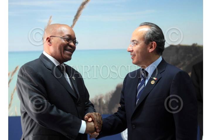 L´AQUILA, LOS ABRUZOS, ITALIA, 08JULIO2009.- Felipe Calderón Hinojosa, presidente de México, durante una reunión que sostuvo con Jacob Zuma, presidente de la República de Sudafrica, esto en el marco de la reunión bilateral del G-5 y que tuvo lugar en la escuela de Suboficiales de la Guardia de Finanzas. FOTO: ALFREDO GUERRERO/CUARTOSCURO.COM