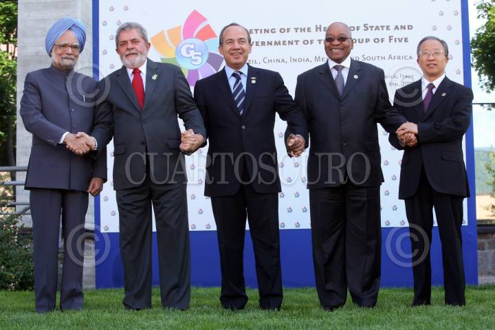 L´AQUILA, LOS ABRUZOS, ITALIA, 08JULIO2009.- Manmohan Singh, primer Ministro de la India, Luiz Inácio Lula Da Silva, presidente de Brasil, Felipe Calderón Hinojosa, presidente de México, Jacob Zuma, presidente de la República de Sudafrica y Wen Jiabao, primer Ministro de China, durante la foto oficial dentro del marco de la reunión del G-5 y que tuvo lugar en la escuela de Suboficiales de la Guardia de Finanzas. FOTO: ALFREDO GUERRERO/CUARTOSCURO.COM