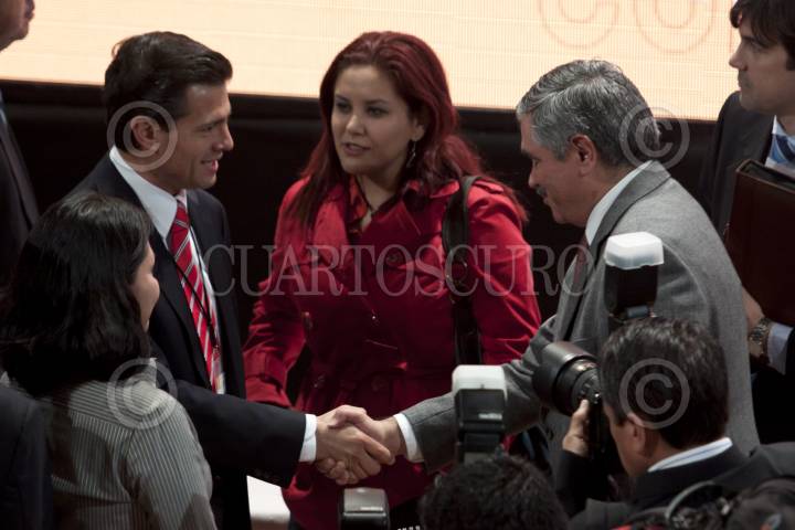 MÉXICO, D.F., 07DICIEMBRE2011.- Enrique Peña Nieto, precandidato del Partido Revolucionario Institucional (PRI) a la presidencia de la República y Leonardo Valdez Zurita, presidente del Instituto Federal Electoral (IFE) durante el panel de Financiamiento de la política y desigualdad social del Foro de la Democracia Latinoamericana que se realizo en el Antiguo Colegio de San Ildefonso. FOTO: RODOLFO ANGULO/CUARTOSCURO.COM