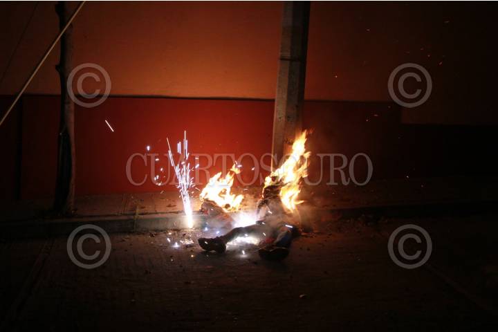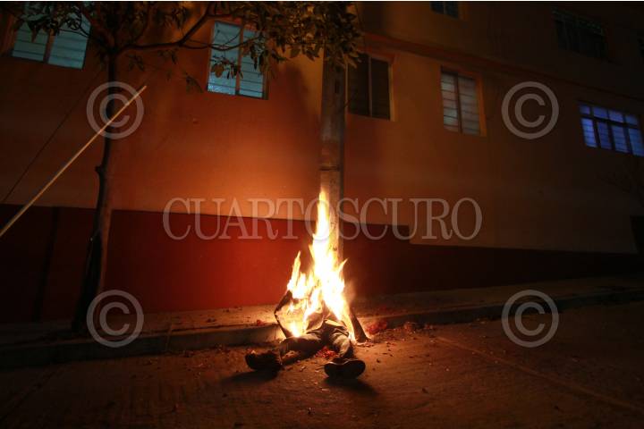 OAXACA, OAXACA, 01ENERO2018.- Como es tradición, en México miles de personas despidieron el año con la quema del "Año Viejo", en Oaxaca una familia preparó su figura con ropa, cartón y cohetes de diversos tipos, al llegar el reloj a las creo horas le prendieron fuego para recibir así el 2018. FOTO: ARTURO PÉREZ ALFONSO/ CUARTOSCURO.COM