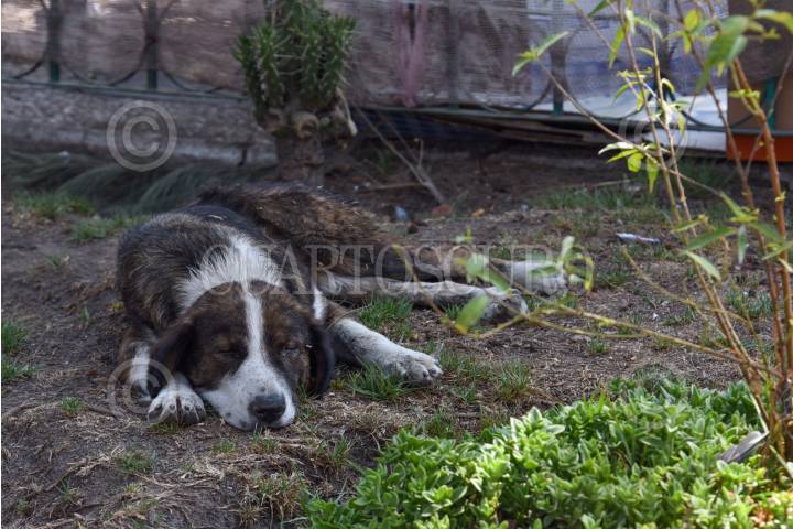 Perros toman el sol en uno de los patios del refugio "La Casa del Mestizo", el cual añberga actualmente 120 perros.
