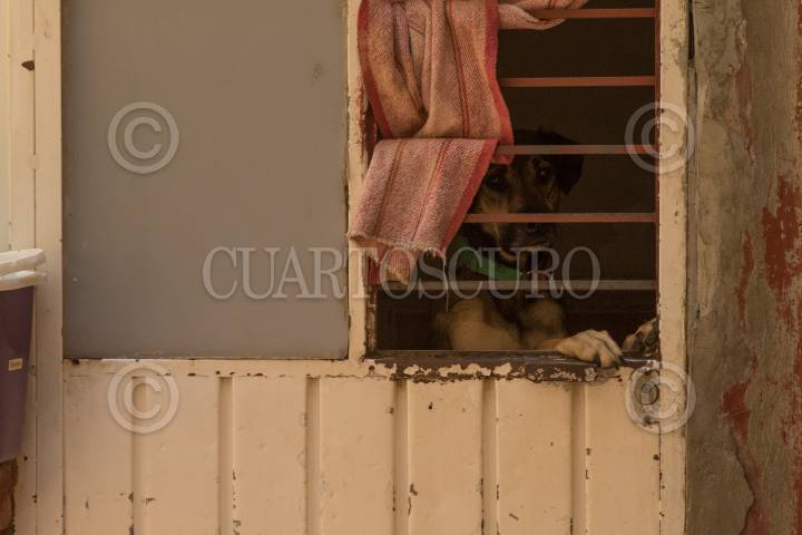 Un perrita mira a través de una de las puertas, ella es la nueva inquilina del refugio de caninos abandonados "La Casa del Mestizo", la pequeña padece de sarna y otras enfermedades.