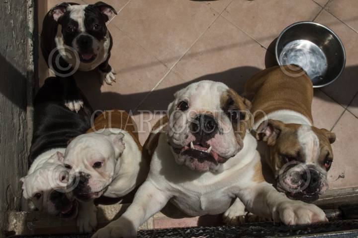Cachorros de la raza Bulldog saltan traviesos en uno de los patios del refugio de perros abandonados "La Casa del Mestizo". Ellos fueron rechazados por criador de esta raza.