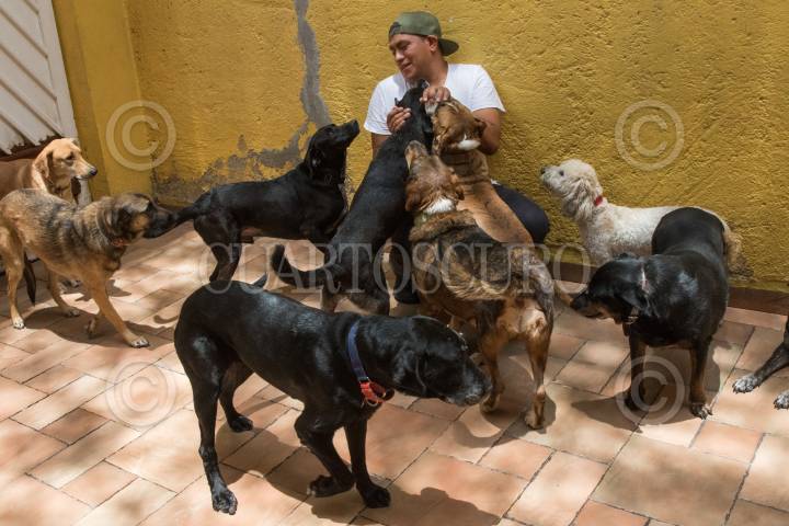 Decenas de perros intentan lamer la cara de Cristian, uno de los jóvenes que ayudan en la atención de más de 120 perros que alberga el refugio "La Casa del Mestizo".