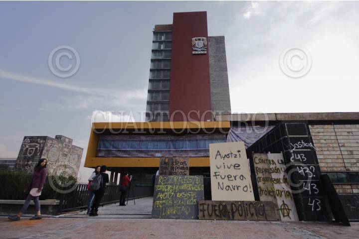 MÉXICO, D.F., 18NOVIEMBRE2014.- Un grupo de jóvenes que mantenian tomado el edificio de Rectoría, abandonaron la barricada que tenían en la entrada principal y de igual forma quitaron las barricadas que mantenian en el circuito universitario. FOTO: ENRIQUE ORDÓÑEZ /CUARTOSCO.COM