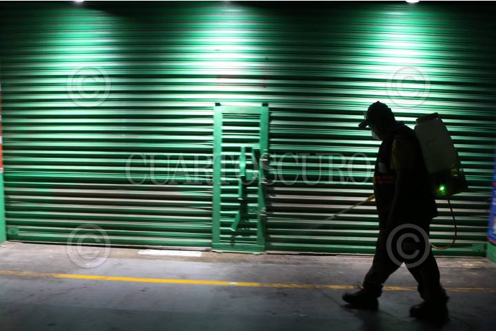 Limpieza y esterilización en la nave de abarrotes de la Central de Abastos frente al COVID-19.