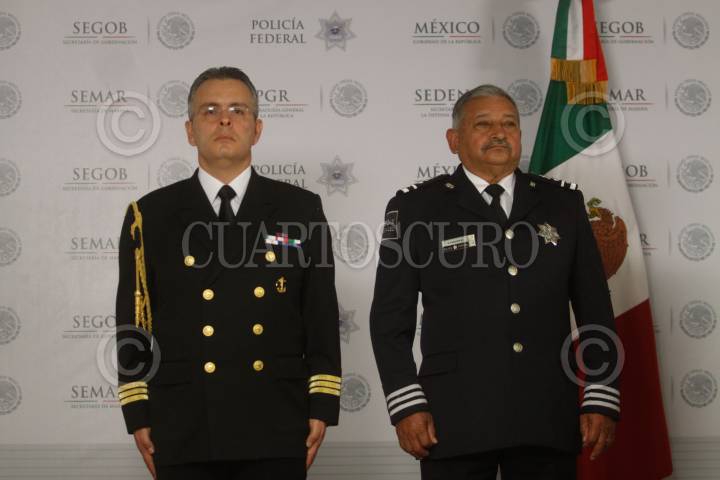 MÉXICO, D.F., 28FEBRERO2014.- Enrique Carlos Ponce de León y Marcos, encargado del área de comunicación social de la Secretaría de Marina y el Comisario de la Policía Federal Darío Chacón Montejo, durante la conferencia de prensa en la cual se confirmó el abatimiento de Francisco Galeana Núñez, alias "El Pantera", uno de los líderes del cártel de Los Caballeros Templarios. El presunto delincuente, quien tenía 49 años, fue abatido durante un enfrentamiento en el municipio de Artega, Michoacán, en el cual se registró también como heridos a dos elementos de seguridad, en lo dicho durante la conferencia que se realizó en la Secretaría de Gobernación. FOTO: MOISÉS PABLO /CUARTOSCURO.COM