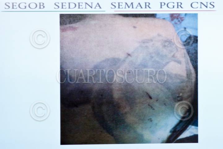 MÉXICO, D.F., 28FEBRERO2014.- Durante la conferencia de prensa en la cual se confirmó el abatimiento de Francisco Galeana Núñez, alias "El Pantera", uno de los líderes del cártel de Los Caballeros Templarios, se mostró una foto de la espalda de presesunto delincuente en donde se observa un tatuaje con el cual se confirma su identidad. El presunto criminal tenía 49 años, fue abatido durante un enfrentamiento en el municipio de Artega, Michoacán, en el cual se registró también como heridos a dos elementos de seguridad, en lo dicho durante la conferencia que se realizó en la Secretaría de Gobernación. FOTO: CUARTOSCURO.COM