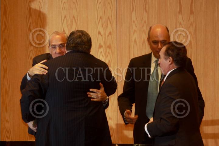 MÉXICO, D.F., 08ENER02010.- Agustin Carstens Carstens, Gobernador del Banco de México, abraza emotivamente a José Anfel Gurria Presidente de la OCDE al termino de su intervención titulada "La Politica Monetaria y la Recuperación Económica en 2010 dentro del Seminario de Perspectivas Económicas 2010 ", realizado en prestigiada universidad de la Ciudad de México. FOTO: SÁSHENKA GUTIÉRREZ/CUARTOSCURO.COM