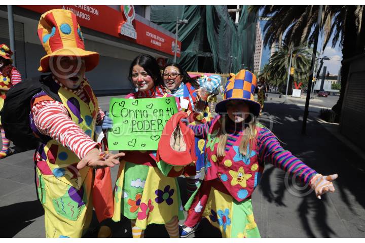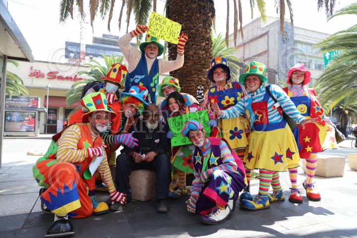 Un grupo de payasos camina por Avenida Juárez repartiendo abrazos y dulces a paseantes, animándolos con carteles de frases motivadoras.