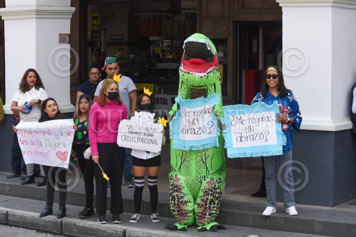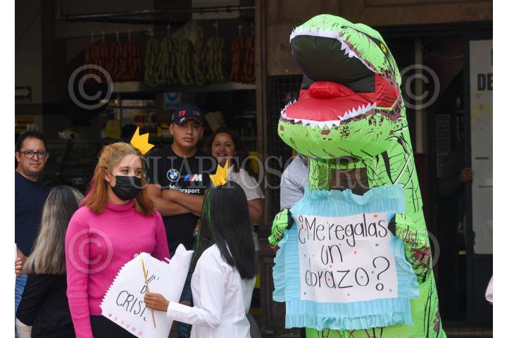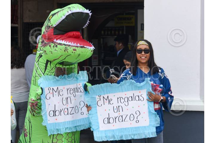 Un grupo de jóvenes y una botarga de dinosaurio regalaron abrazos en los Portales de Toluca.
