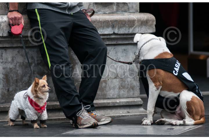 MÉXICO, D.F., 10DICIEMBRE2014.- Ante el intenso frío dos perros fueron abrigados para ser paseados por las calles del centro histórico. Decenas de capitalinos salen a las calles abrigados debido a las bajas temperaturas que se sienten en gran parte de la ciudad. FOTO: DIEGO SIMÓN SÁNCHEZ /CUARTOSCURO.COM