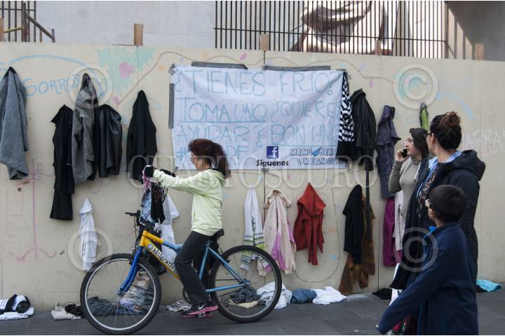 MÉXICO, D.F., 20DICIEMBRE2015.- Un grupo de usuarios de redes sociales convoco a una campaña de ayuda a las personas que no cuenten con ropa para poder abrigarse ante el frío invernal, invitando a la gente que guste donar una prenda, a colocarla sobre el muro ubicado en avenida Juárez, y así la gente que la necesite pueda tomarla de forma gratuita. FOTO: DIEGO SIMÓN SÁNCHEZ /CUARTOSCURO.COM