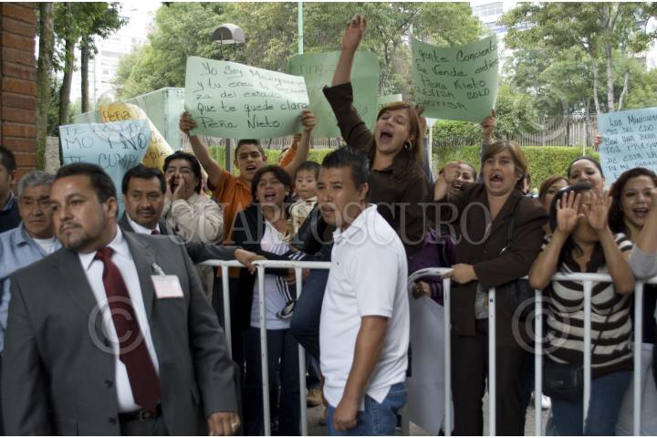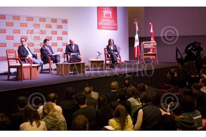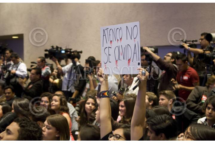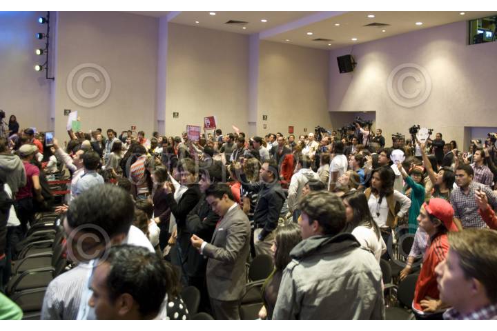 MÉXICO, D.F. 06NOVIEMBRE2012.- La canciller Patricia Espinoza participó en la inaguración XXIV Asamblea General del Consejo Latinoamericano de Ciencias Sociales CLACSO, de donde tuvo que salir por la puerta trasera después de chiflidos y gritos de “asesinos", "no a los asesinatos de migrantes”, "fraude", entre otros, por parte de estudiantes de la UNAM, UAM y COLMEX que asistieron al evento e interrumpieron la ponencia de Espinoza. FOTO: JUAN PABLO ZAMORA /CUARTOSCURO.COM