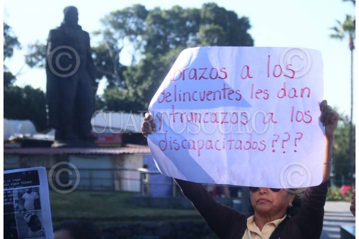 CUERNAVACA, MORELOS, 16 ENERO 2024.- Familiares y amigos del joven Marvin de 18 años de edad con discapacidad intelectual protestaron por su detención arbitraria ocurrida el pasado viernes por policías del municipio de Emiliano Zapata. Su madre Elizabeth Moreno detalló que el joven cursa el segundo año de secundaria en el Centro de Atención Múltiple número 19 y que su capacidad intelectual es de un niño de 10 años. El pasado viernes el joven fue detenido cuando visitaba la tumba de su abuelo, en el panteón de la colonia Prohogar por policías del municipio quienes lo involucraron en el robo de una motocicleta y un bolso. Los uniformados, según su hermana, lo golpearon durante la detención y agregó que se le acusa de robo y portación de arma, por lo cual podría ser sentenciado hasta 37 años de prisión. A cinco días de la detención el joven ha sido trasladado al penal de Atlacholoaya e integrado a la población general, por lo que sus familiares piden una audiencia con las autoridades a la vez que protestan por el abuso policiaco que se hace costumbre en el municipio. FOTO: MARGARITO PÉREZ RETANA/CUARTOSCURO.COM