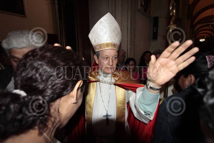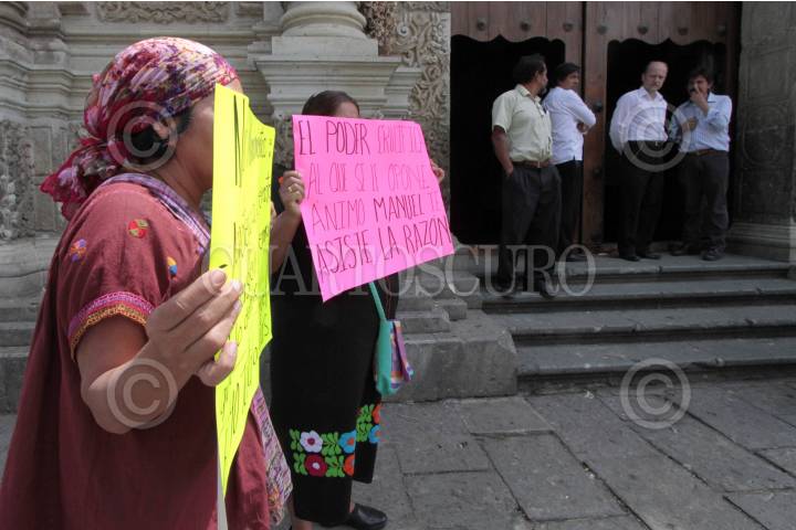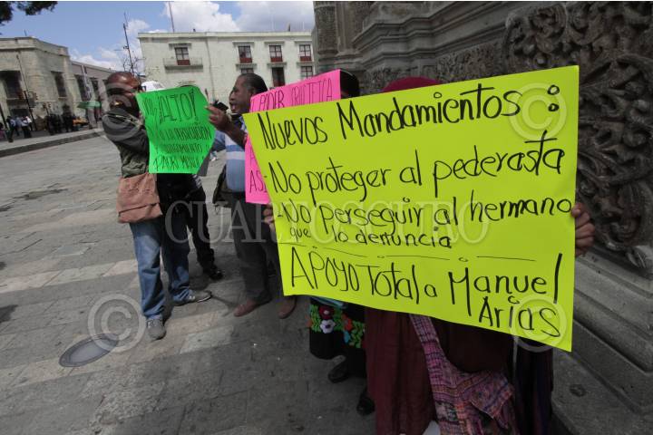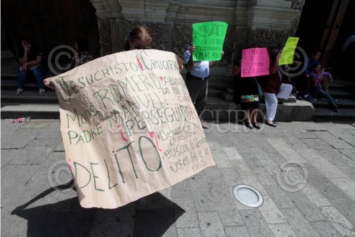 OAXACA, OAXACA., 06MARZO2016.- Feligreses pertenecientes a la parroquia de la Inmaculada Virgen de Juquila se manifestaron este domingo en la catedral de la ciudad de Oaxaca donde oficiaba misa el arzobispo, José Luis Chávez. Los manifestantes acusaron al jerarca católico de perseguir a su párroco Manuel Arias en venganza por haber denunciado al clérigo Gerardo Silvestre de abuso de menores. Por su parte el arzobispo se negó a hablar del tema. FOTO: ARTURO PÉREZ ALFONSO /CUARTOSCURO.COM