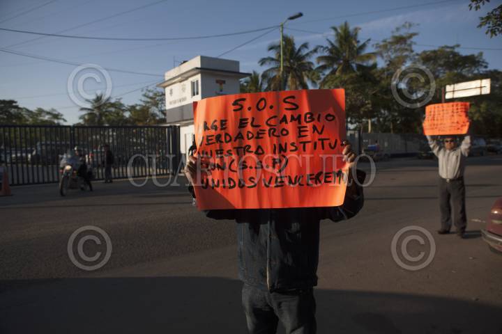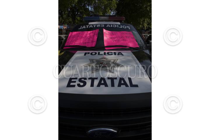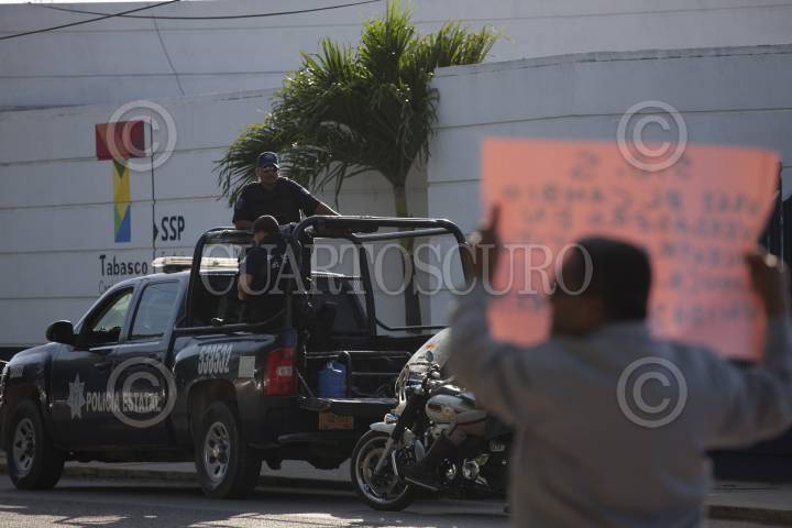 VILLAHERMOSA, TABASCO, 17ENERO2014.- Al menos unos cien elementos policíacos de la Secretaria de Seguridad Pública activos y que terminaban sus labores se manifestaron a las afueras de dicho edificio para hacer púbicas las anomalías al interior de la corporación. Los cuerpos de justicia revelaron de abusos, amenazas y violaciones a los derechos laborales y humanos; en estos momentos están plantados con pancartas en las instalaciones del H. Congreso local, donde acusan al secretario de la dependencia, general retirado Audomaro Martínez Zapata de no poder resolverles el conflicto y detener los abusos. FOTO: MARCO POLO GUZMÁN HERNÁNDEZ /CUARTOSCURO.COM