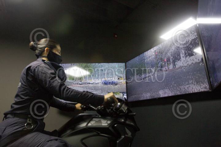 Una mujer policía utiliza la motocicleta virtual como parte de su entrenamiento en la Academia de Seguridad Pública.