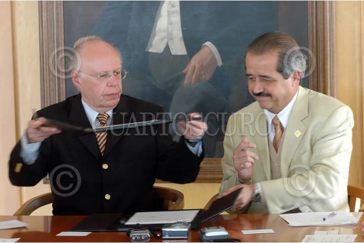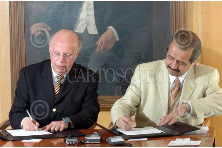 MÉXICO D.F., 11ENERO2008.- El secretario de salud José ángel Cordova Villalobos y el rector de la UNAM, dr. José Narro firmaron un convenio de colaboración para el desarrollo de actividades academicas, docentes, de investigación y difusión cultural para proteccion y atención de la salud de los mexicanos. FOTO: CUARTOSCURO.COM