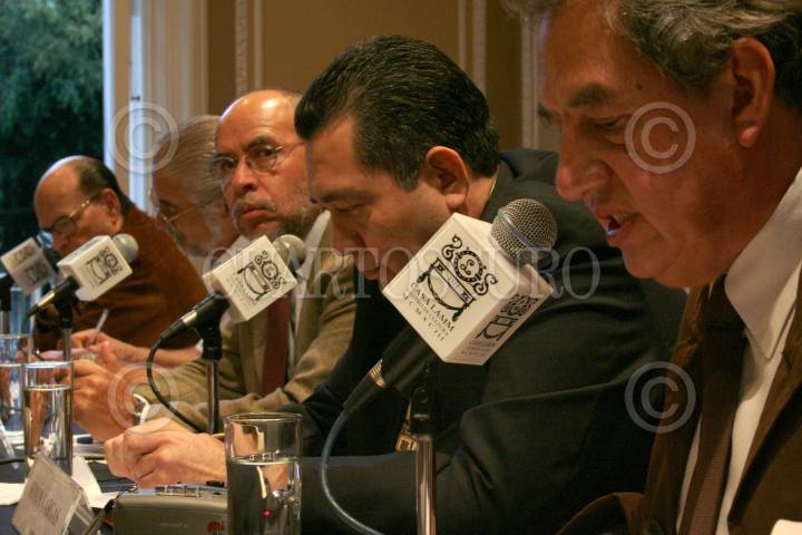 MÉXICO,D.F.02MAYO.2008.- Roberto Badillo Martínez, encargado de de la Comisión de Defensa de la Camara de Diputados, Celeste Saenz de Miera presidenta del Club de periodistas, Juan Ramon Jimenez, academico de la UNAM y Jorge Santa Cruz. coordinador de Actividades Académicas de la Asociación de Radiodifusores del Valle de México, durante el foro "PEMEX Seguridad Nacional y Petróleo", realizado en el Club de Periodistas. FOTO: SAUL LOPEZ/CUARTOSCURO.COM