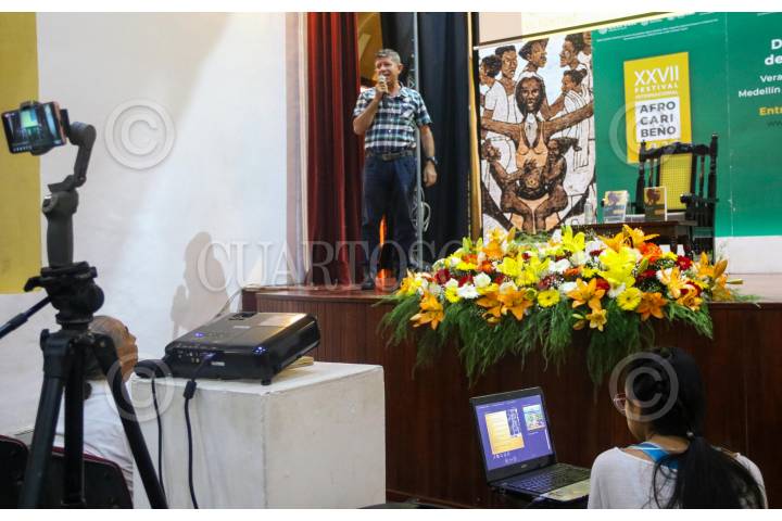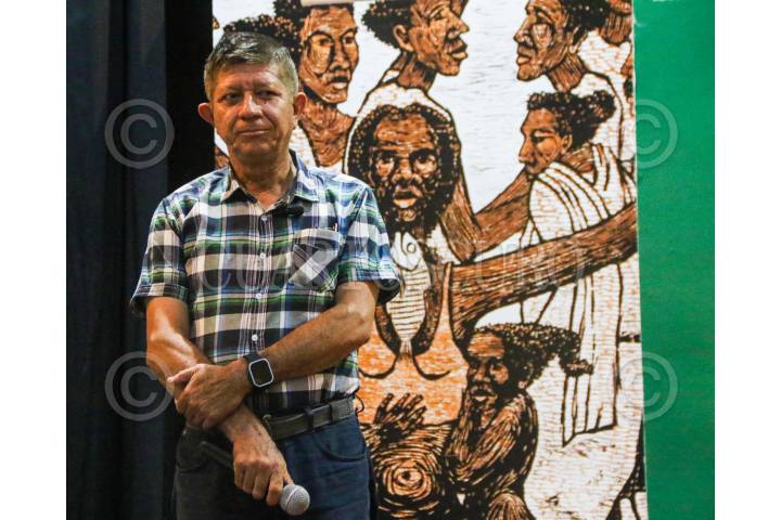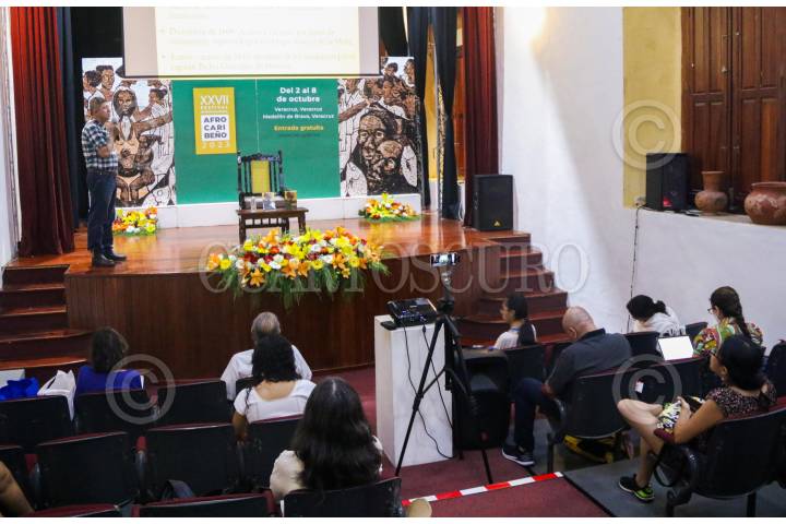 PUERTO DE VERACRUZ, 07OCTUBRE2023.- El Doctor Alfredo Delgado, en su conferencia magistral sobre la participación y disputas entre Afrodescendientes e indígenas en zonas del México antes de la independencia. FOTO: VICTORIA VALTIERRA/CUARTOSCURO.COM