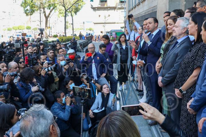 Christian Von Roehrich, coordinador de los diputados en el Congreso de la Ciudad de México; Andrés Atyde, dirigente local del PAN, encabezaron la presentación de una acción de inconstitucionalidad en contra del aumento de tarifas del agua en la Ciudad de México, en las escalinatas de la SCJN.