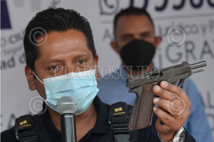 Un elemento de la Secretaría de Seguridad Ciudadana (SSC) muestra un arma durante la acción institucional "Sí al Desarme, Sí a la Paz 2022" en la alcaldía Cuajimalpa.