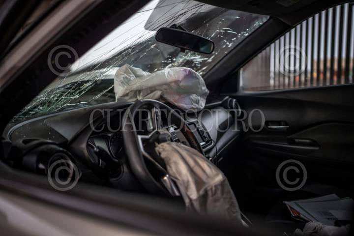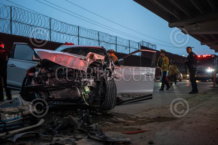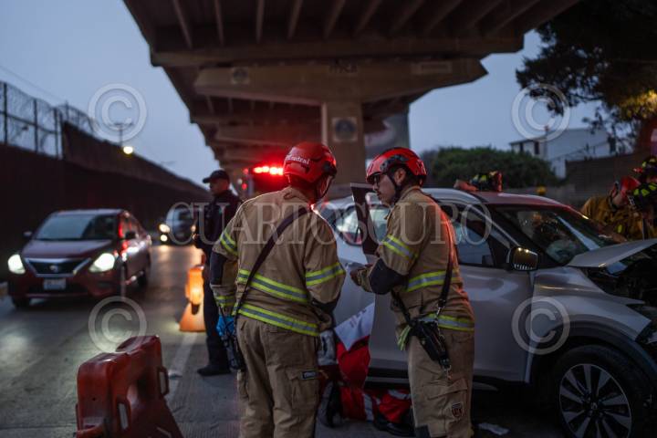 TIJUANA BAJA CALIFORNIA 20AGOSTO2025.- Fuerte accidente vehicular se registró en la avenida Internacional dejando el saldo de dos mujeres de la tercera edad lesionadas. El vehículo en el que viajaban, un Nissan Kicks color blanco, quedó impactado contra una de las estructuras de concreto del viaducto elevado. Paramédicos de la Cruz Roja llegaron al lugar para atender el siniestro. Ambas mujeres sufrieron fracturas como consecuencia del impacto por lo que fueron trasladadas a un hospital cercano. El percance registrado la mañana de este miércoles, generó congestionamiento vehicular en la zona, mientras autoridades realizaban el peritaje correspondiente y retiraban la unidad accidentada. FOTO: CHRIS NOYOLA / CUARTOSCURO.COM