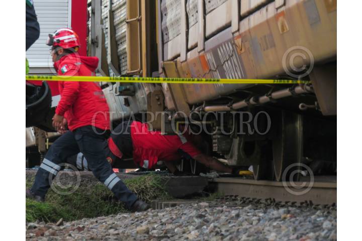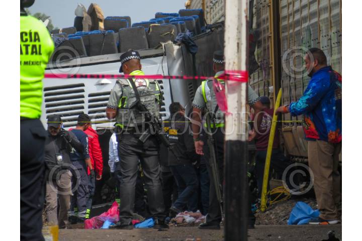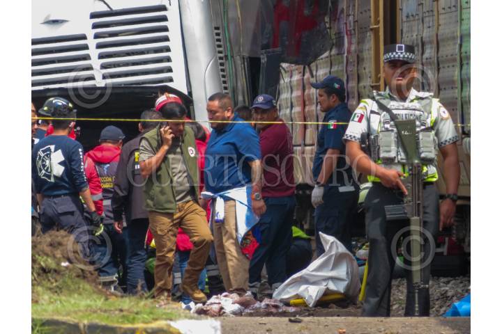 ATLACOMULCO, ESTADO DE MÉXICO, 08SEPTIEMBRE2025.- Servicios de emergencia y Servicio forense recuperan los cuerpos de las personas que fallecieron durante el accidente del tren que se llevó un camión de la línea Herradura de Plata en Atlacomulco. La zona permanece acordonada por policías estatales, municipales y GN. FOTO: CRISANTA ESPINOSA AGUILAR/CUARTOSCURO.COM